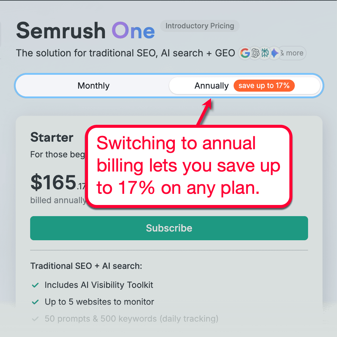By switching your Semrush plan subscription to “annual,” you’re eligible for a 17% discount.